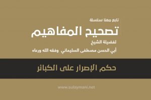 [ حكم الإصرار على الكبائر ] الكبيرة: هي ما تُوُعِّد عليها بعقاب دنيوي أو أخروي، أو ترتب عليها حد من الحدود، أو تعرض الواقع فيها للعن، أو غضب، أو تهديد، أو ذم،...